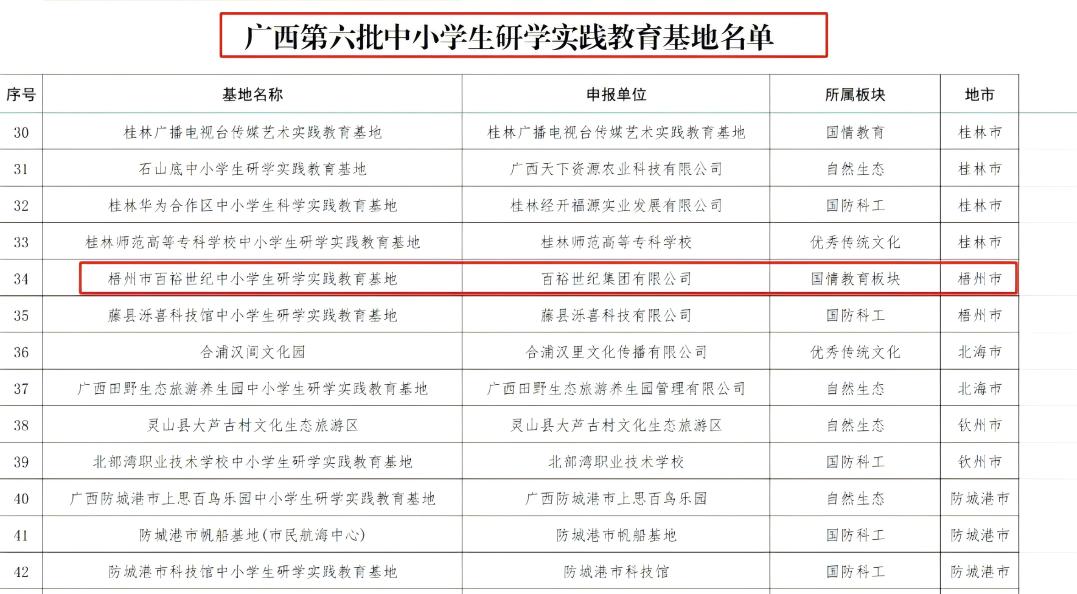根據《自治區教育廳關于開展2024年全區中小學生研學實踐教育系列評選活動的通知》(桂教基教〔2024〕13號)要求,自治區教育廳組織各地開展廣西第六批中小學生研學實踐教育基(營)地和2024年中小學生研學實踐教育精品課程(線路)申報推薦工作。百裕世紀(集團)有限公司入選廣西第六批中小學生研學實踐教育基地名單。