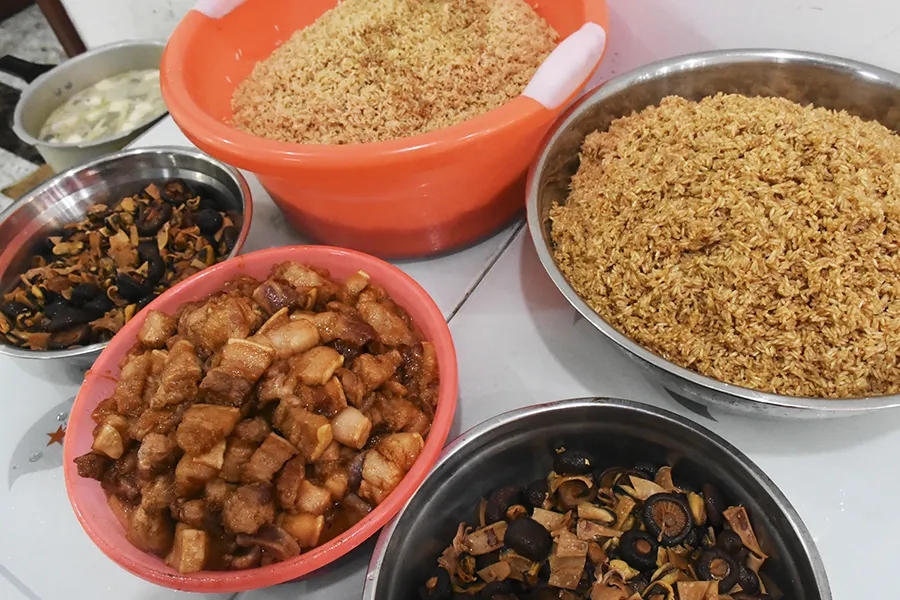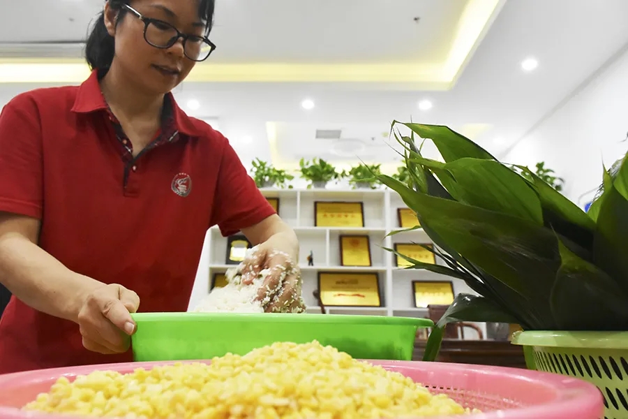 后勤部精心為大家準備了豐富的食材五花肉、雞蛋、香菇、魷魚、海蠣、綠豆,并根據員工喜好調配好兩種不同口味餡料。